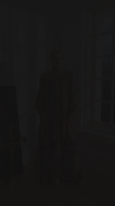 Detail kerah shanghai memberikan kesan clean dan sophisticated. Pada bagian lengan terdapat puff kerut di ujung lengan yang menciptakan siluet feminin dan manis. Tampilan semakin eksklusif dengan detail list bludru hitam pada bagian depan serta yoke belakang, menghadirkan aksen kontras yang elegan.